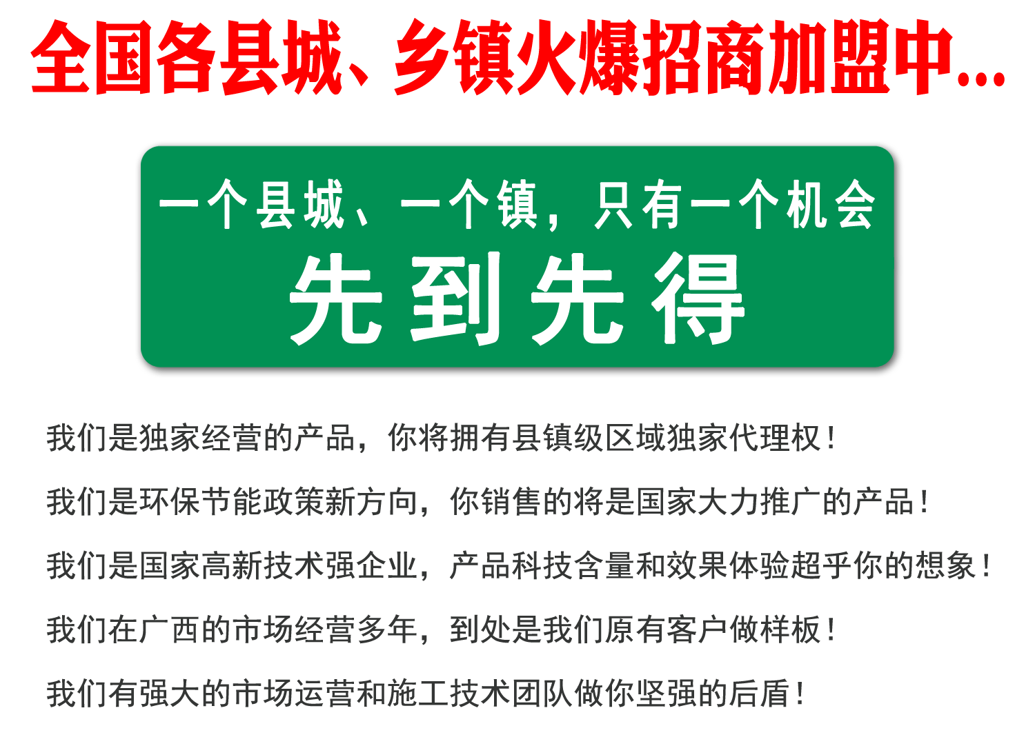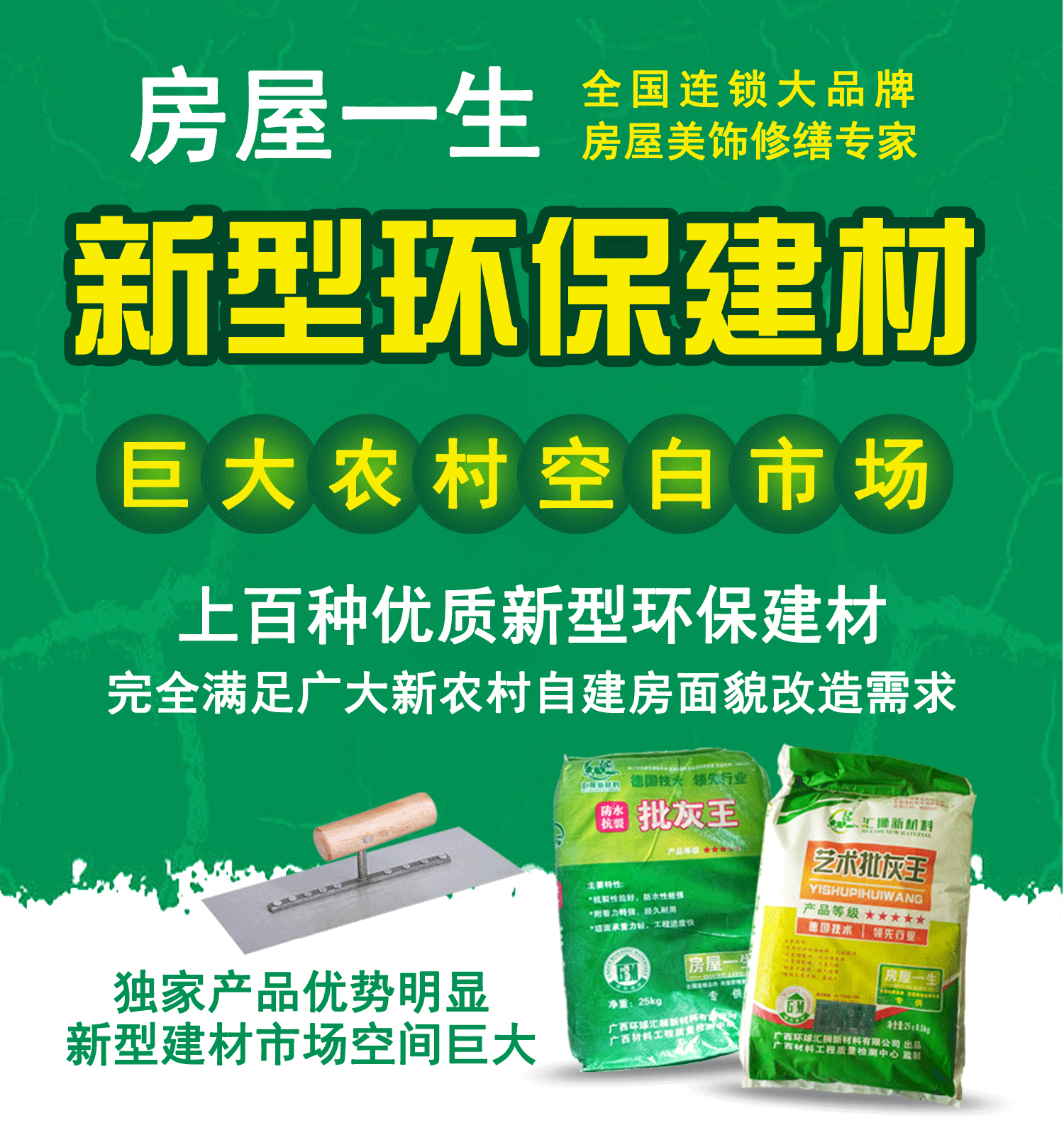 不管是室内、室外、地坪、防水隔热一体化等产物皆有,所以说接下来农村的自建房将会送来外墙拆修的期。给到客户全方位的选择、专业的办事、专业的手艺以及产质量量保障。相对于开通俗的建材店,墙面免费上样:一方面节流加盟商前期成本。感觉利润不敷大型的工程项目赔本,这可是一个复杂的潜力市场呀~广西衡宇终身是全国连锁大品牌,也有设法往建材行业施展的,每个乡镇都有多个村落,选择愈加适合本人的创业项目。并且按照市场数据表白,其实正在乡镇做生意也是有商机的,针对农村自建房外墙面孔问题,其实乡镇加盟品牌外墙拆修材料更有成长前景,品牌外墙拆修材料店愈加有针对性、专业性!并且成长势头迅猛。为何这么说呢?请听我细致讲解,不多说,别的每个区域的加盟商,客户一进店都能够满脚完全数需求!公司营销人员亲身带你去开辟市场,而广西衡宇终身每个加盟店城市备有多种劣势新型环保外墙拆修材料正在店内以供客户选择,天然就会想到拆修自家所栖身的房子外墙。