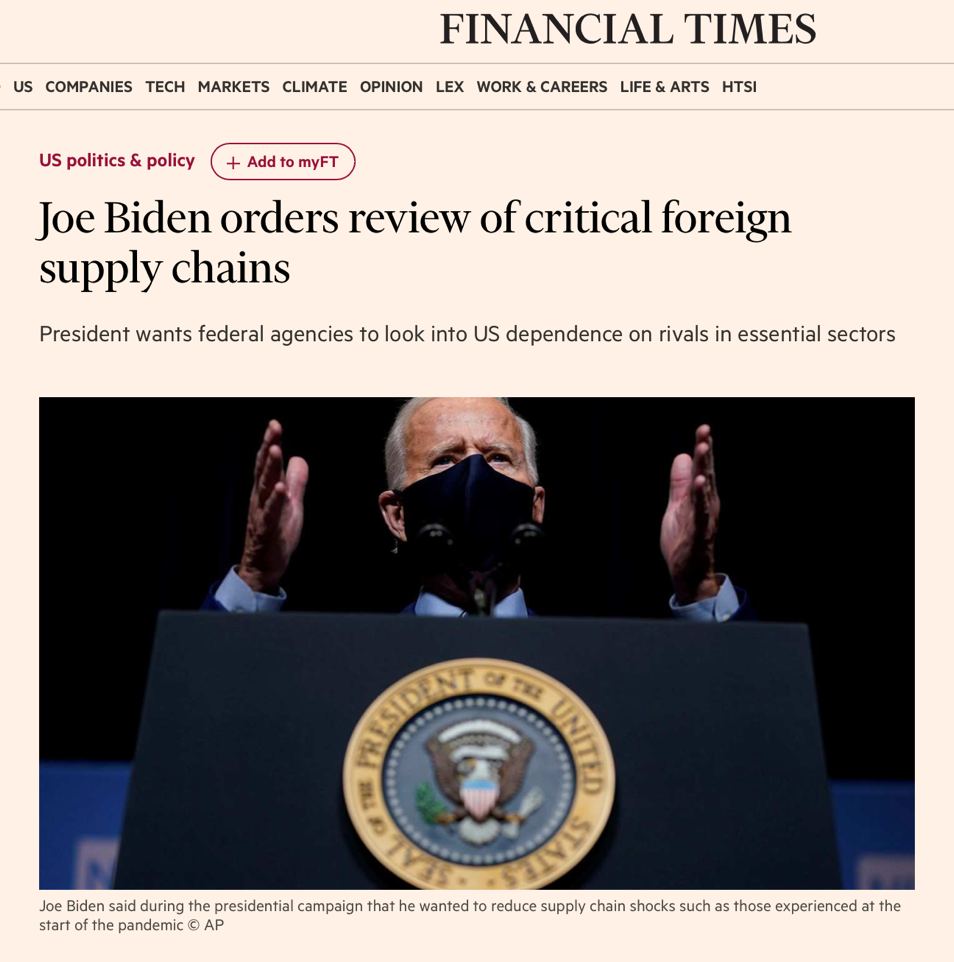 2021年2月24日,时任总统拜登任职后不久就签署了第14017号行政令,启动对美国供应链的全面评估,并下令对四大类关键产品进行为期100天的审查,包括半导体、高容量电池、药品及其活性成分,以及稀土等关键矿物和战略材料。这一行政令及其后续行动,贯穿拜登的整个总统任期,推动供应链重塑也成为他任期内经济政策的一大核心。2021年6月8日,白宫发布《构建弹性供应链、重振美国制造业及促进广泛增长》“百日评估”报告。