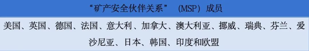 在美国国内,美国众议院成立跨党派工作组——“关键矿产政策工作组”。在美国之外,2022年6月,美国牵头成立“矿产安全伙伴关系”(MSP),更通俗地说,就是“矿产北约”。它的实际目的是对华脱钩并构建西方关键矿产供应链小圈子。